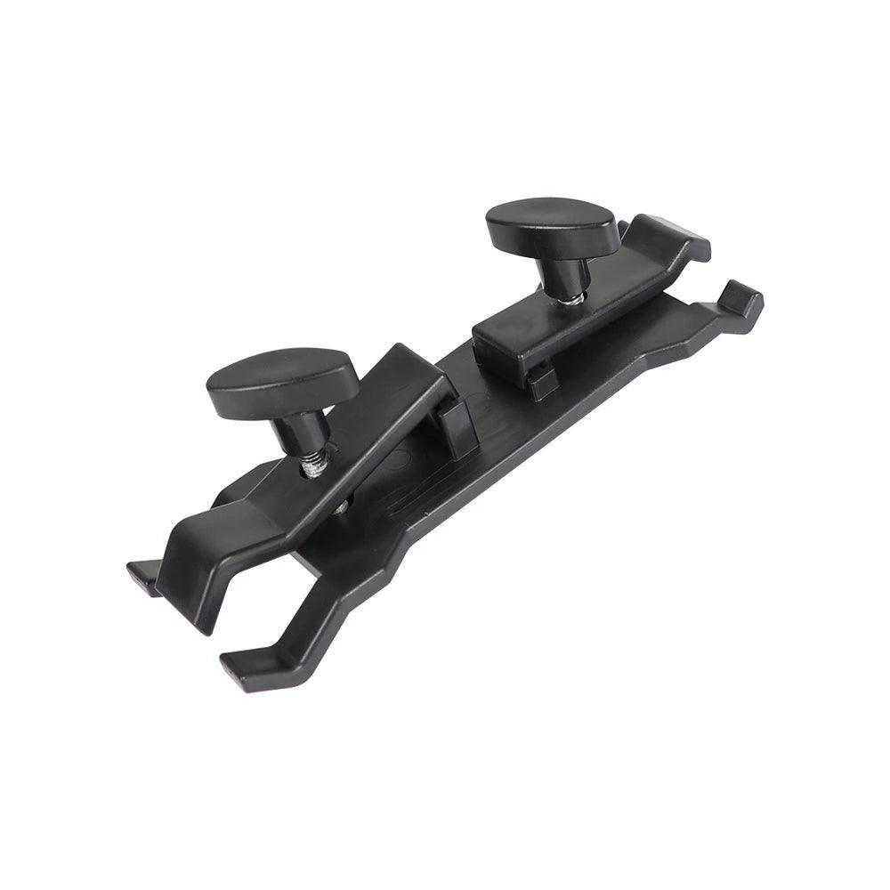 A braçadeira pode segurar um mini guarda-chuva de um lado e um tripé do outro lado.